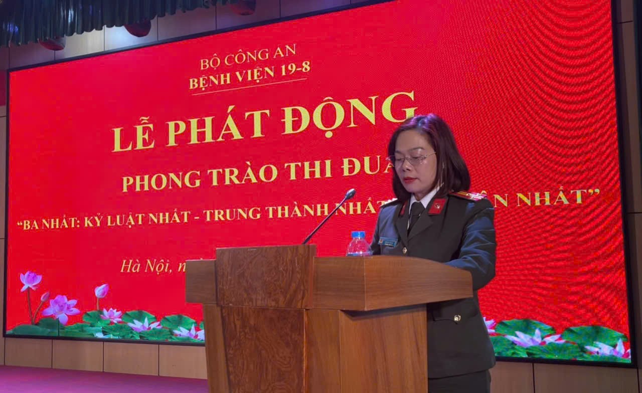 Thay mặt cán bộ, công nhân viên Bệnh viện 19-8, đồng chí Thượng tá Nguyễn Thị Thanh Nga, Trưởng phòng Chính trị phát biểu hưởng ứng thực hiện phong trào thi đua “Ba nhất”, bày tỏ quyết tâm thực hiện phong trào thi đua “Ba nhất” có hiệu quả, cụ thể hoá tinh thần “Ba nhất” bằng những hành động thiết thực nhất phù hợp với đặc thù của lực lượng y tế Công an nhân dân và phù hợp với đặc thù của Bệnh viện 19-8.