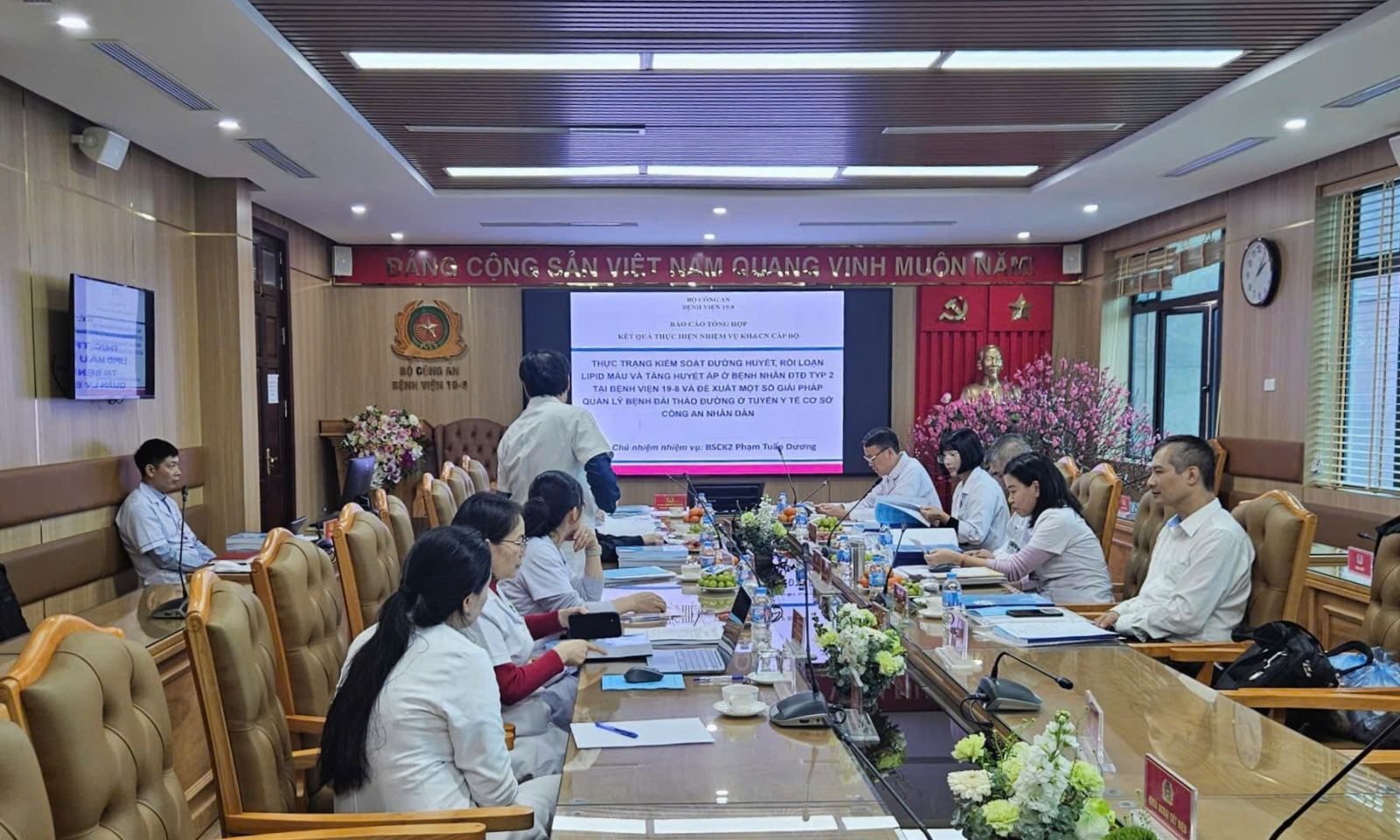 Trong buổi họp nghiệm thu, đánh giá đề tài có TS.BSCKII, Đại tá Nguyễn Thái Hưng - Phó Giám đốc Bệnh viện 19-8 (Chủ tịch Hội đồng). Bên cạnh đó, các thành viên tham gia Hội đồng nghiệm thu còn có: TS.BS, Đại tá Đỗ Thị Lệ Thúy - Phó giám đốc Bệnh viện 19-8 (Phó Chủ tịch Hội đồng); PGS.TS Vũ Bích Nga - Nguyên Viện Trưởng Viện Đái tháo đường, Rối loạn chuyển hóa lipid, Đại học Y Hà Nội (Ủy viên phản biện 1); TS.BS Nguyễn Ngọc Tâm - Phó trưởng khoa Nội tiết - cơ xương khớp, Bệnh viện Lão khoa Trung ương (Ủy viên phản biện 2); TS.BS, Thượng tá Nguyễn Minh Tuấn - Phó Giám đốc Bệnh viện 19-8 (Ủy viên), TS.BS Lê Quang Toàn - Nguyên Trưởng khoa Đái tháo đường, Bệnh viện Nội tiết Trung ương (Ủy viên); Ths.BS, Trung tá Trịnh Thị Phương Nhung – Phó Trưởng phòng Phòng Đào tạo và Chỉ đạo tuyến, Bệnh viện 19-8 (Ủy viên - Thư ký); Khách mời tham gia buổi nghiệm thu đề tài gồm có TS. Nguyễn Công Quyền – Phòng 2 – V04 (Đại diện cơ quan quản lý nghiên cứu khoa học của Bộ Công an) và các cán bộ y tế trong bệnh viện quan tâm.