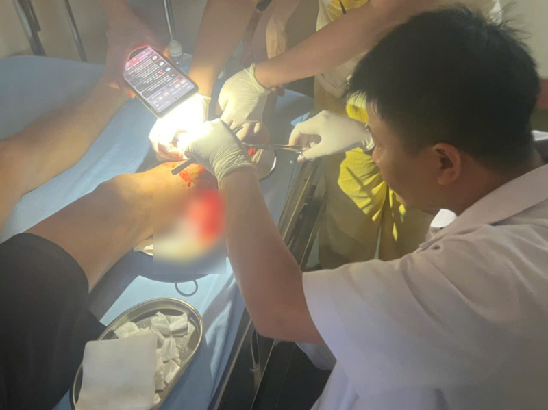 Bác sĩ Bệnh xá số 1, Công an tỉnh Thái Nguyên khâu vết thương cho bệnh nhân bằng ánh sáng của đèn điện thoại.