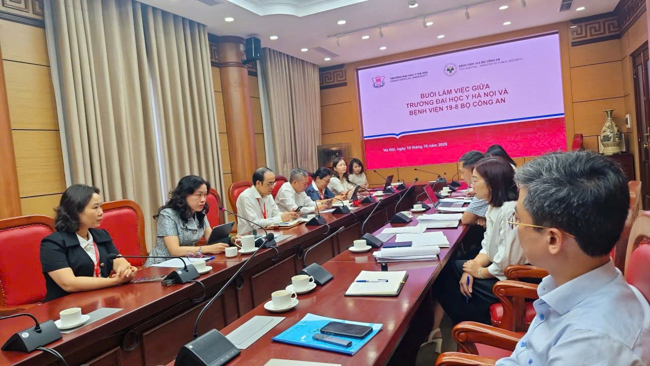 Được sự đồng ý của Bộ Công an và Bộ Y tế, ngày 10/10/2025 tại Trường Đại học Y Hà Nội, Bệnh viện 19-8 Bộ Công an và Trường Đại học Y Hà Nội đã tổ chức buổi làm việc về một số nội dung, trọng tâm là công tác hỗ trợ nguồn nhân lực chất lượng cao cũng như hỗ trợ phát triển chuyên môn cho Bệnh viện 19-8.